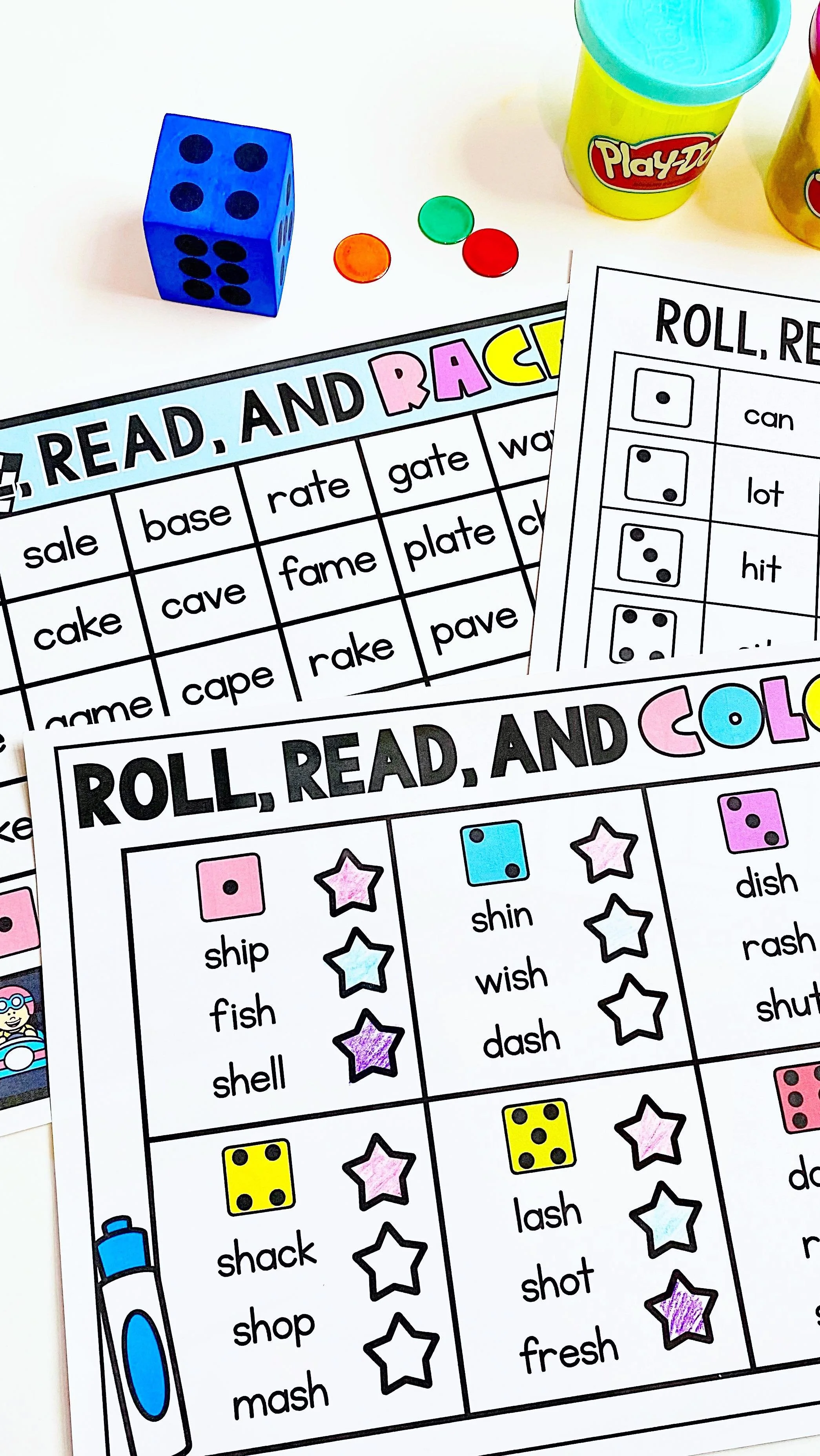 Differentiating during literacy centers (when students were not with me) was something I struggled with. It felt so time consuming to make all those copies, prep materials, etc. After years of trial and error, I finally found a solution! One of the literacy centers my students go to is, seat work. This is a worksheet or literacy center bag they take to their seat. For their first seat work center, students are all completing the same activity, but practicing a different targeted phonics skill. I color code the trays with a star. There are three total star colors. My students are assigned a specific color.